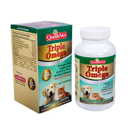 TRIPLE-OMEGA es un suplemento alimenticio que ayuda a mantener una excelente salud de pelaje y piel en perros y gatos. Su fórmula de Omega 3 y Omega 6 enriquecidos con vitaminas, lo hace un excelente suplemento que actúa sobre los sistemas inmunológico y nervioso.